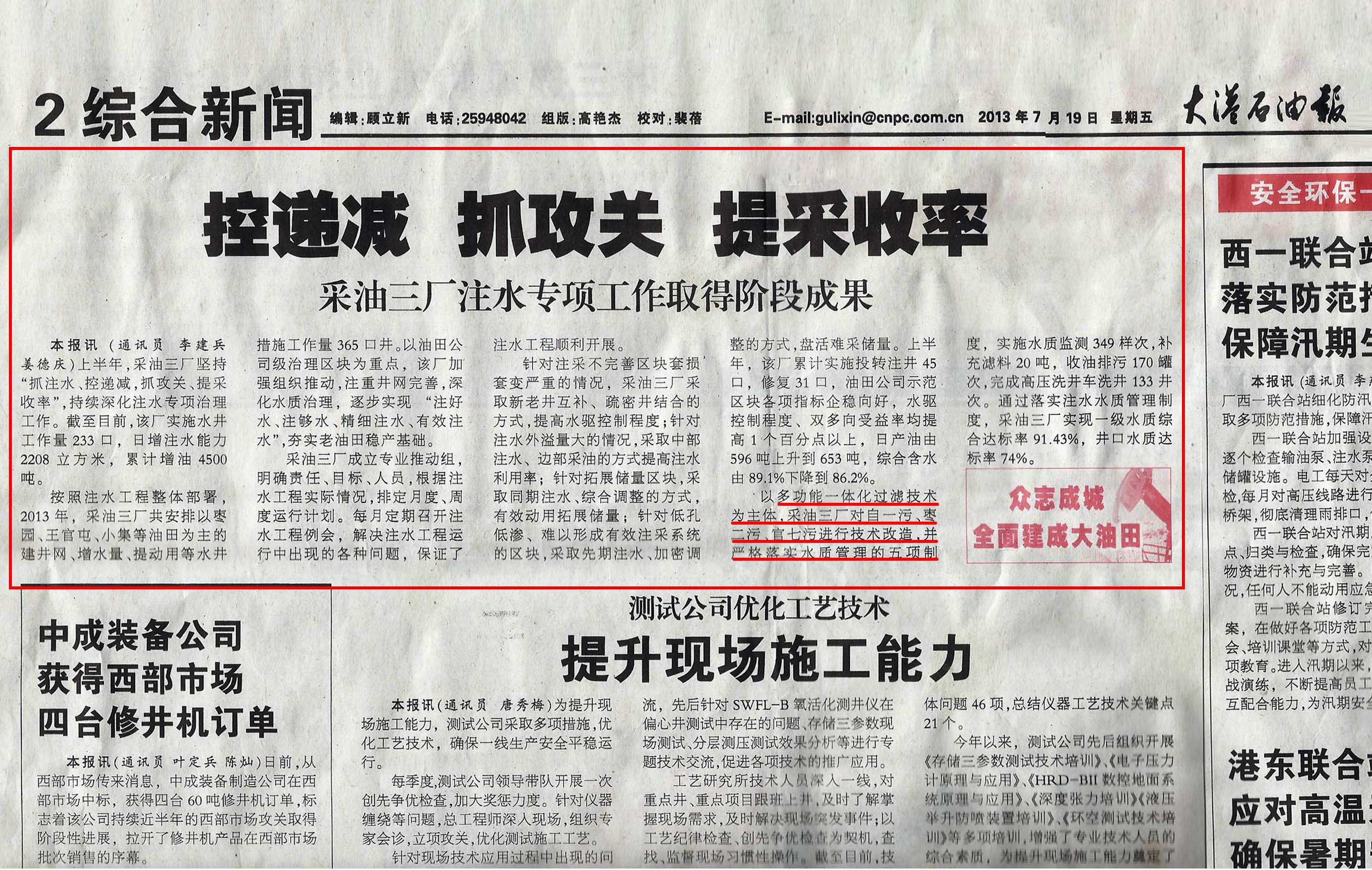 2013年6月公司產(chǎn)品被《大港石油報》多次報道